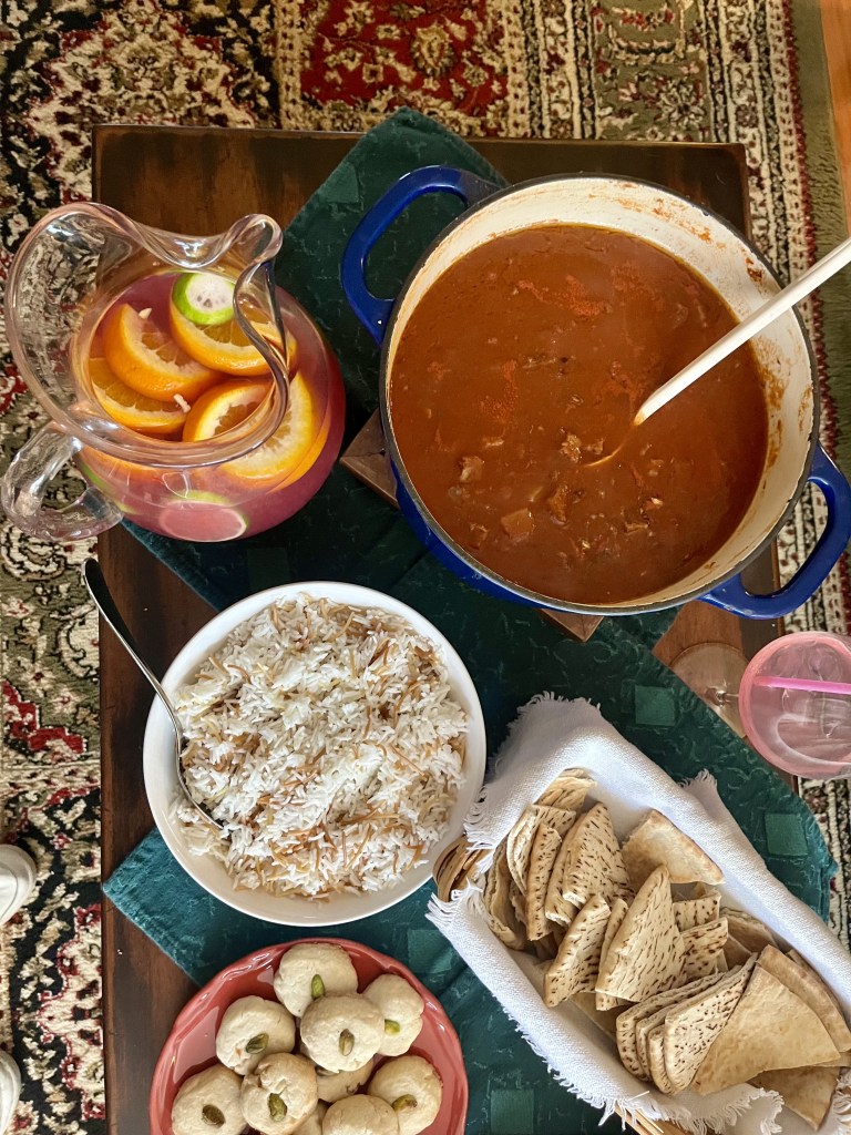 Nothing warms you more on an overcast day than a warm comforting bowl of stew and an exciting Formula 1 race. Our F1 family celebrated the Saudi Arabia Grand Prix with Dawood Basha, a delicious potato and kufta stew, served over vermicelli rice. Baked feta with honey and thyme, hummus, pitas, Ghraybeh (Middle Eastern Pistachio Shortbread) and a refreshing pomegranate margarita completed our meal. Cora, my beautiful Lab-Pei has a habit of sneaking into the pictures. She’s a good girl!