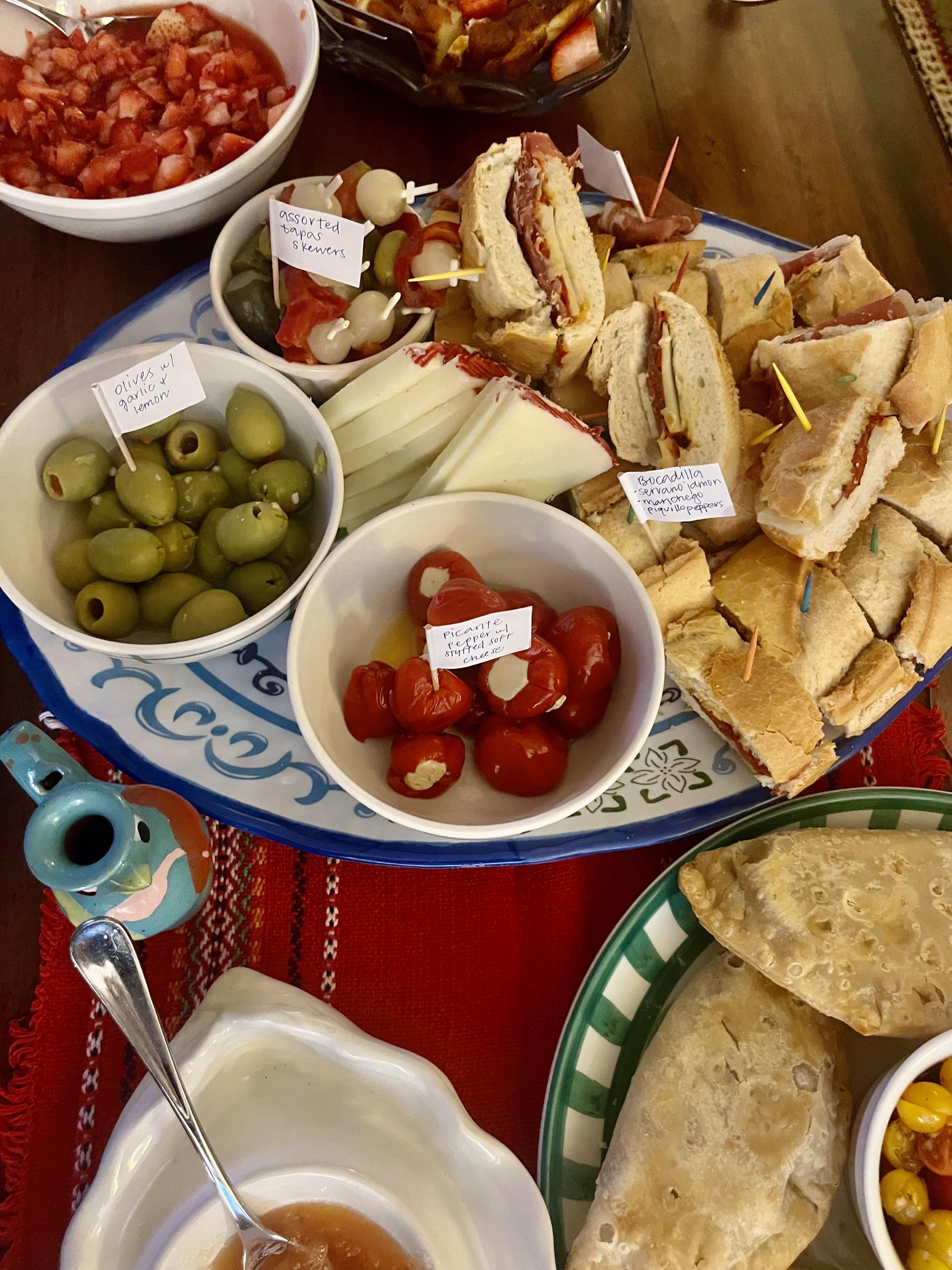 Tapas-style dining was the order of the day for the Spanish Grand Prix and the “small plates” did not disappoint. Thanks to Caitlin, Ami and Alison, recent travelers to Spain for keeping it real. We started with an assortment of tapas skewers, stuffed picante peppers, garlic and lemon soaked olives, Serrano Jamón and of course plenty of Manchego cheese. We followed up with Serrano Jamón, Manchego and piquillo pepper bocadillas, chicken empanadas, salt and pepper calamari and Spanish tomato + butter bean dip. A delightful Basque cheesecake and refreshing Palomas capped the celebration.