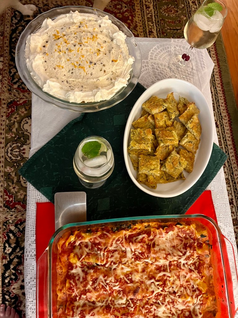 Mangia! Back to Imola, the scene of last year’s undeniably favorite F1 meal. Maureen played nonna and served us a Perfect Vegetable Lasagna. A Crispy Prosciutto, Strawberry and Burrata Salad with Maple-Balsamic Vinaigrette and some Italian Zucchini Scarpaccia were delicious accompaniments. Once again, master-mixologist Caitlin plied us with a refreshing cocktail, the Hugo Spritz. A sweet, nutty Cannoli Pie finished our Italian meal, one that will be hard to beat