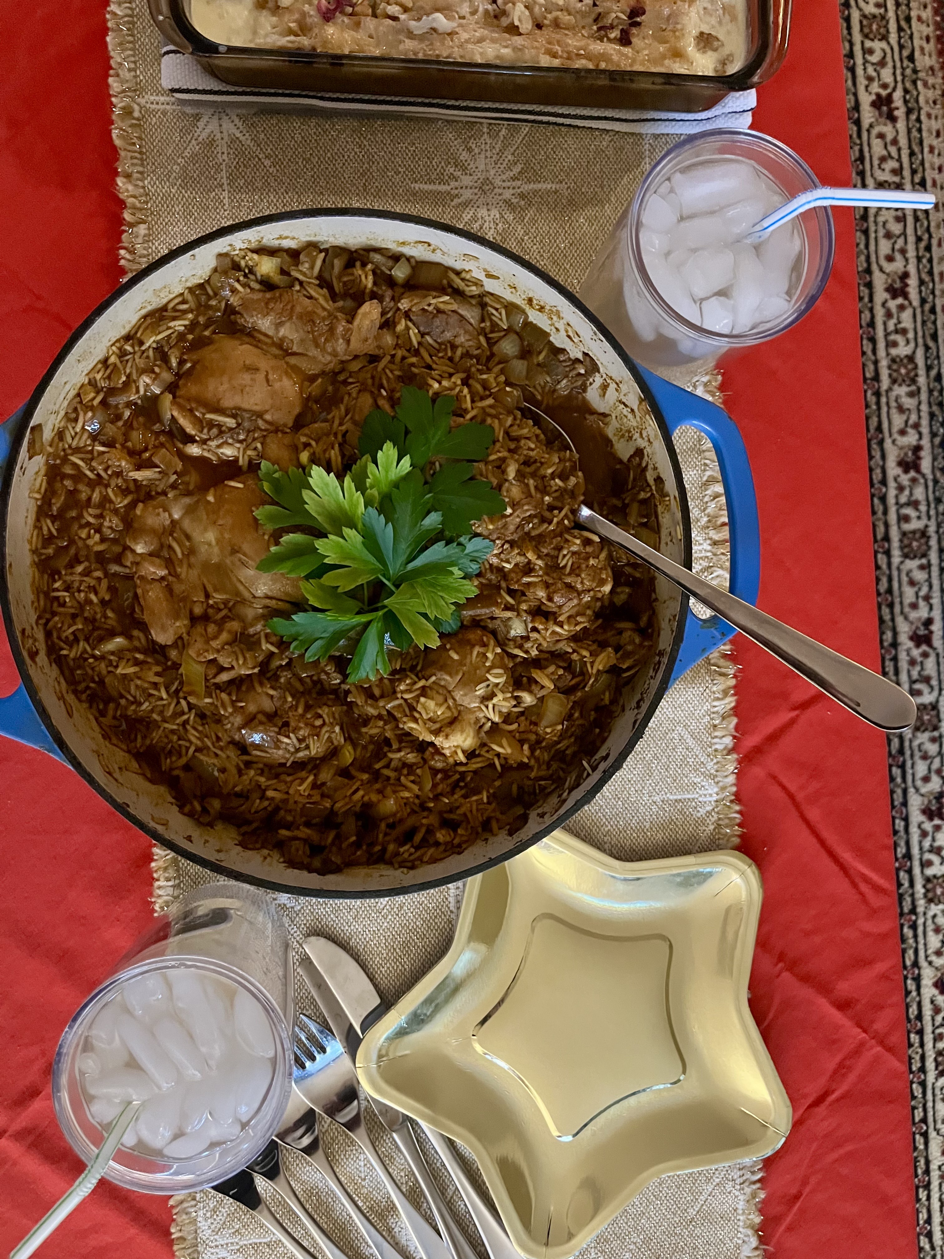 • Chicken Kabsa, tender chicken served over warmly spiced rice.